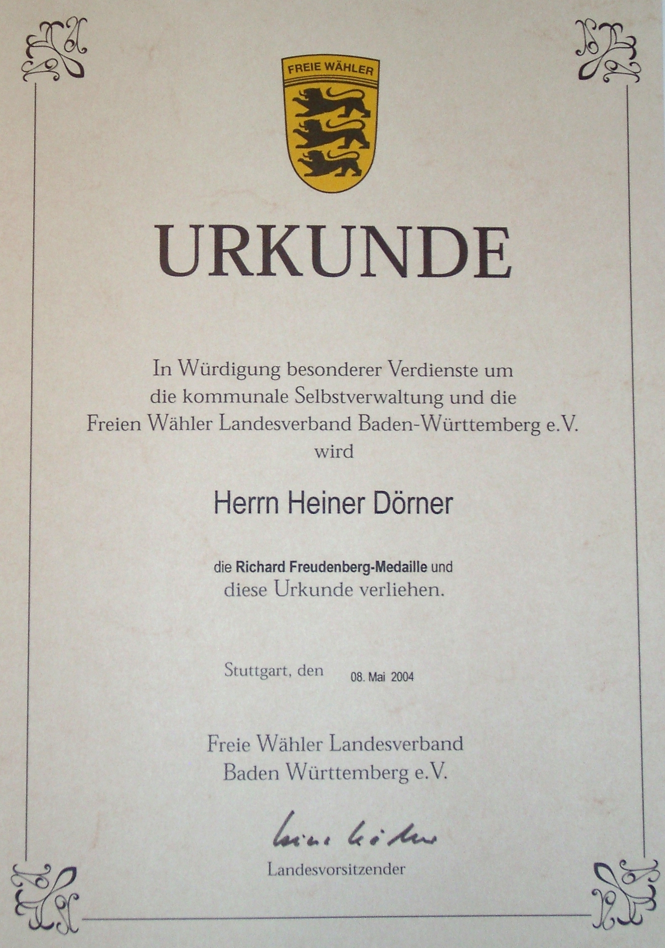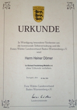 Auf Vorschlag von Ministerpräsident Erwin Teufel hat der Bundespräsident Johannes Rau dem wissenschaftlichen Mitarbeiter am Institut für Flugzeugbau der Universität Stuttgart, Herrn Dipl.-Ing. Heiner Dörner, das Verdienstkreuz am Bande des Verdienstordens der Bundesrepublik verliehen. Das Verdienstkreuz wurde Herrn Dörner, Jahrgang 1940, am 2. Juli 2001 vom Oberbürgermeister der Stadt Heilbronn, Helmut Himmelsbach, überreicht.
